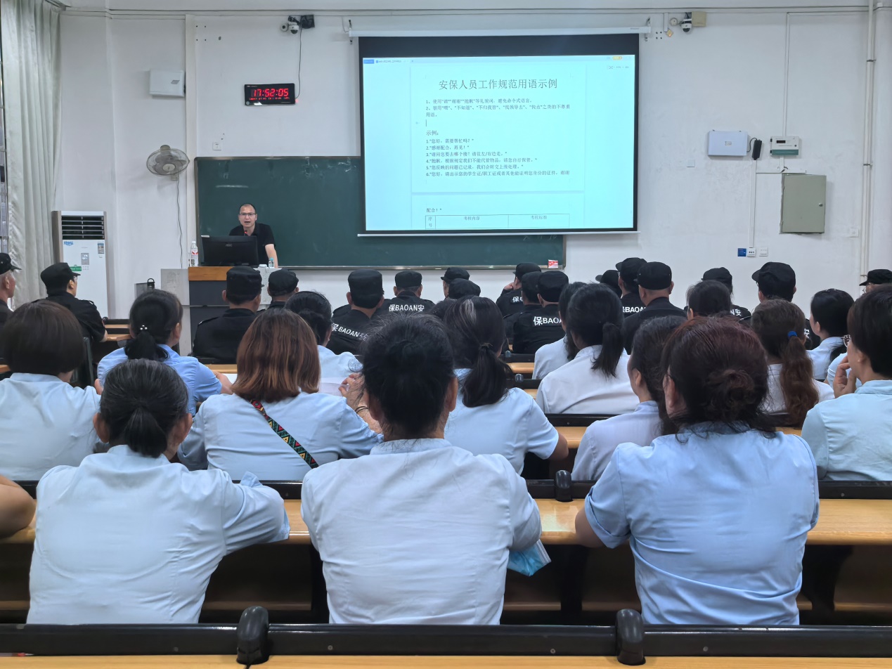 武装部(保卫处)开展保安、宿管素质提升专题培训 发布时间:2025-06-18 08:48:52 浏览次数: 次 【字体:小 大】 为筑牢校园安全防线,提升校园保安、宿管队伍专业化、规范化水平,6月14日,武装部(保卫处)组织开展两校区全体保安、宿管素质提升专题培训。 此次培训以新制定的《安保人员岗位手册》为规范,围绕门岗管控、楼宇巡查、校园巡逻、宿舍管理等岗位特点,重点开展岗位行为规范、文明礼仪标准、突发事件处置流程、师生服务意识等专项培训,切实提升保安、宿管服务意识和综合素养,维护学校良好形象,为师生营造安全和谐的校园环境。 1 仙葫校区培训现场 明秀校区培训现场 分享到: 【打印正文】