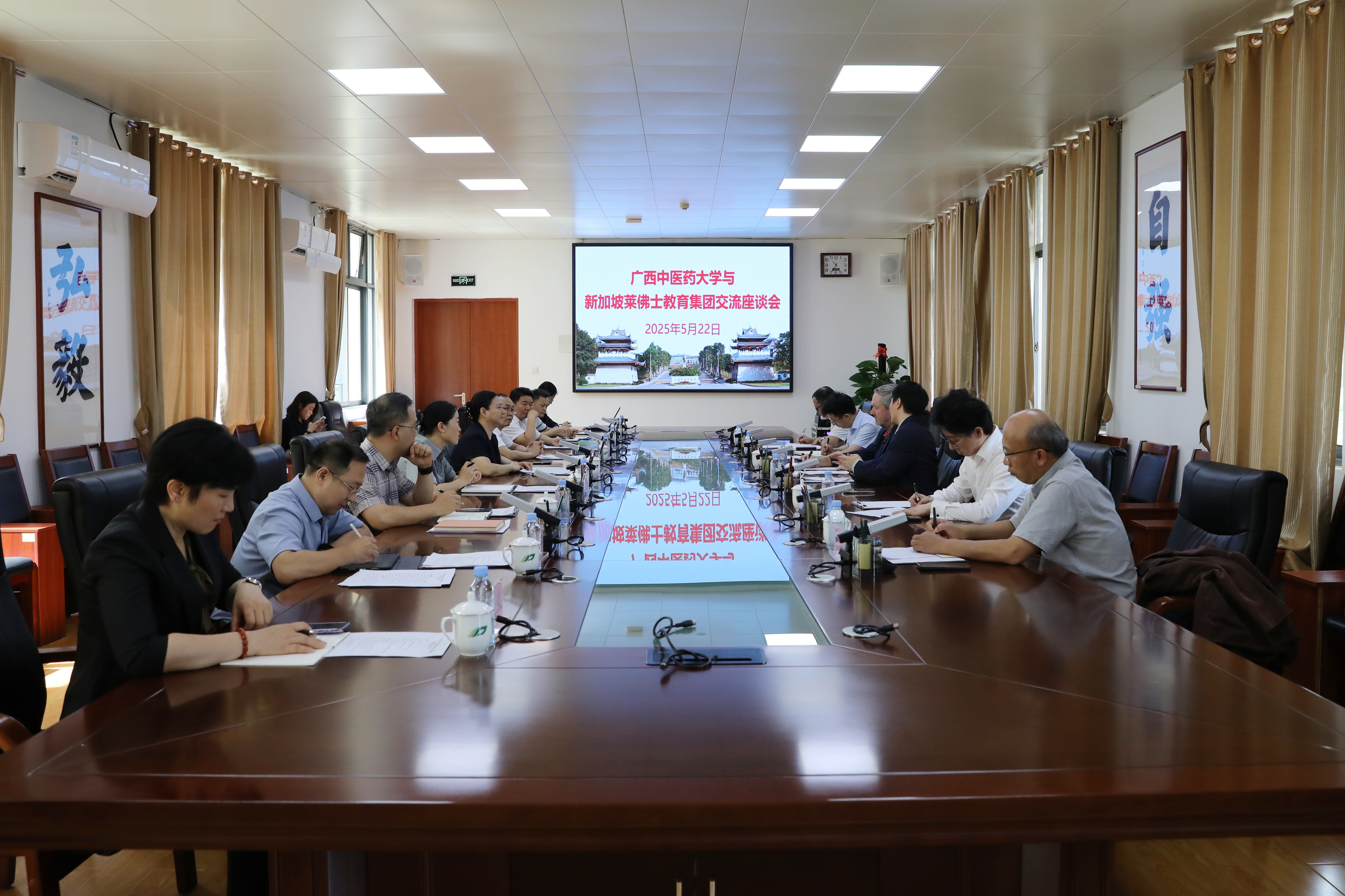 2025年5月22日上午,新加坡莱佛士教育集团代表格雷德一行6人到访beat365官网仙葫校区参观交流。学校党委副书记、校长姚春,发展规划处(学科建设办公室、医院管理与社会服务处)处长莫雪妮等相关部门负责人出席座谈会,会议由学校党委常委、副校长唐振宇主持。