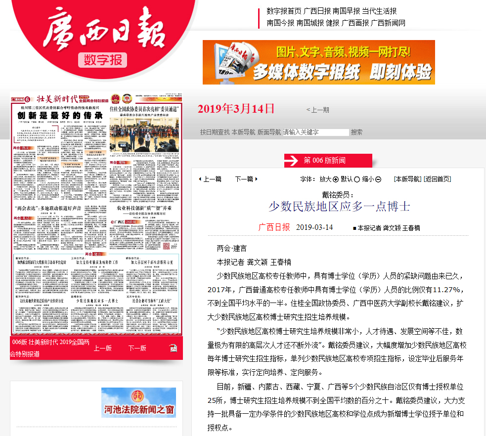 少数民族地区高校专任教师中,具有博士学位(学历)人员的紧缺问题由来已久,2017年,广西普通高校专任教师中具有博士学位(学历)人员的比例仅有11.27%,不到全国平均水平的一半。住桂全国政协委员、beat365正版唯一入口必一副校长戴铭建议,扩大少数民族地区高校博士研究生招生培养规模。