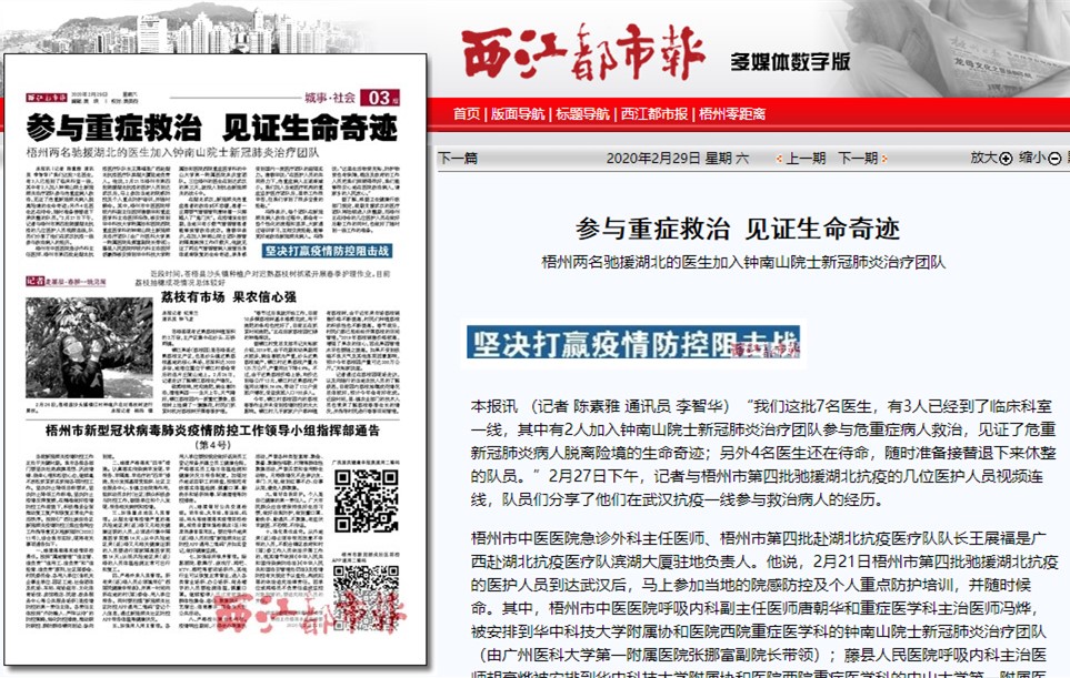 (新闻原标题:参与重症救治 见证生命奇迹梧州两名驰援湖北的医生加入钟南山院士新冠肺炎治疗团队)