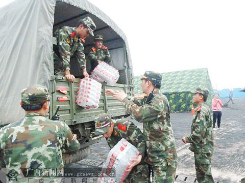 驻桂武警为思延乡送来水和大米等紧缺物资。