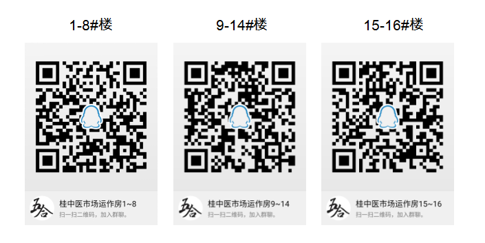 ①生活区1-8#楼业主请进入“桂中医市场运作房1-8”群(群号639031071);