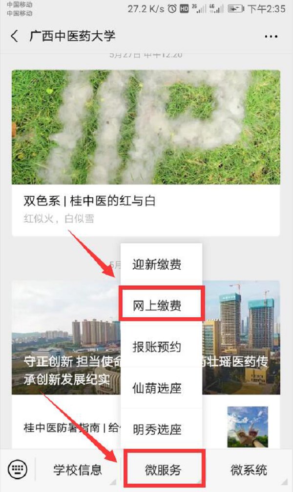 (2)进入微信公众号,点击“微服务”—“网上缴费”