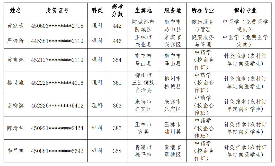根据自治区卫健委、教育厅、中医药局联合下发的《关于全面落实2021年农村订单定向医学生免费培养招录任务的通知》以及beat365官网《关于全面完成2021年农村订单定向医学生免费培养招生任务的通知》等文件精神,结合学生报名情况,拟将2021级黄家乐等2名同学的录取专业调剂为本科中医学(免费医学定向)专业,拟将杨世康等5名同学的录取专业调剂为高职针灸推拿(农村订单定向医学生)专业,现将名单公示如下: