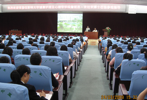 英国伍斯特大学健康与社会学院的詹妮思·克拉克博士和凯伦·拉蒂默博士于2009年3月20日到我护理学院进行访问教学。为加强和促进我方对英国护理事业的认识和了解,我院特邀请詹妮思·克拉克博士于2009年3月24日下午为中医学院附属单位护理人员举办题为“英国老年护理体系和现状的简介”的学术讲座。护理学院部分师生、重阳老年公寓相关工作人员、中医学院一附院和瑞康医院的护理人员参加了本次学术讲座,护理学院院长吴彬主持了本次讲座。