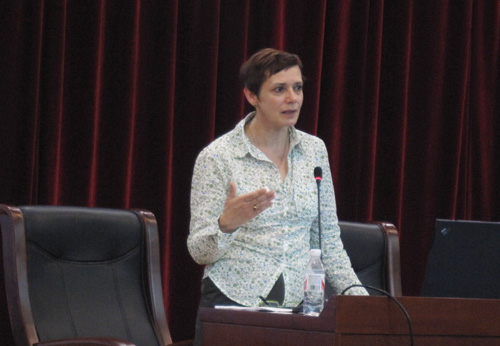 詹妮思博士是英国伍斯特大学健康与社会学院的硕士课程领导人。本次讲座由詹妮思博士全程使用英语进行演讲,她主要围绕当前英国老年护理服务模式的发展、注册护士如何提高对老人的服务质量、如何分析和应对老年人跌倒现象及如何护理老年痴呆症病人等多个方面进行讲解。