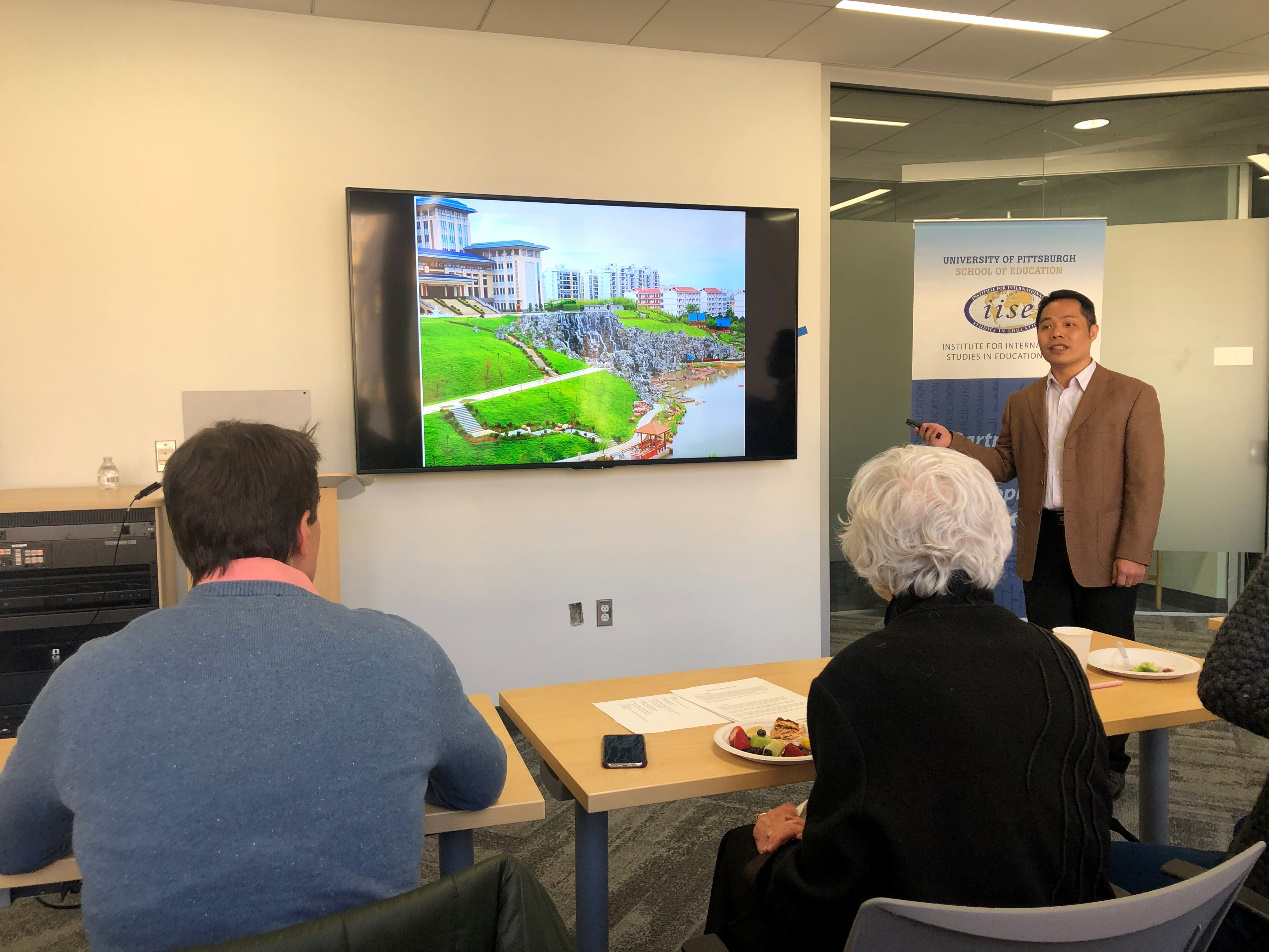 近日,正在美国匹兹堡大学访学的外语部方宝老师,给匹兹堡大学教育学院的师生们做了一场题为“Trends in International Higher Education Students Studying Abroad in China——Data Analysis, Problems, and Suggestions”(来华留学生教育的变化趋势研究——数据分析、现存问题与发展建议)的英文学术讲座。在讲座的前部分,方宝老师介绍了beat365正版唯一入口必一的概括,并通过丰富的图片,展示了beat365官网风景秀丽的校园环境、独具特色的国际壮医医院等。现场师生对beat365官网新校区建设所体现出的秀美景观以及人文情怀表示由衷赞叹。