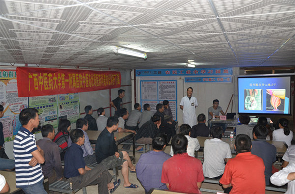 晚上8时,一附院专家团队来到仙葫分院工地食堂,食堂里早已经坐满了等候讲座的农民工。一附院男科副主任王权胜博士和推拿科杨宇主治医师,分别做了“慢性前列腺炎性心理治疗”和“腰椎间盘突出症的中医防治”的科普知识讲座,两位讲课专家以生动的比喻、风趣的语言,选取最贴近工人生活的讲课内容赢得了工人们的阵阵掌声。在讲座的过程中,专家们还为工人进行了免费义诊。专家耐心的解答工人们提出的相关常见病、日常保健等问题,推拿科杨宇医师在现场示范了推拿科的康复按摩手法及腰腿疼的日常保健功能锻炼。预防保健科刘程晖主管护师,在讲座现场和农民工宿舍区,免费给工人们发放防艾计生用品。农民工师傅们纷纷表示,平时在工地工作非常辛苦,本次健康科普知识讲座和义诊的选题十分契合工地工人的需求,为工人们送来关爱、送来了健康知识。