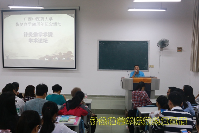 11月18日,在庆祝学校“恢复办学六十周年”之际,针灸推拿学院在明秀校区西B1教室举办了主题为“督、冲、任三脉和月经不调关系的理论与临床探讨”的研究生学术论坛活动,并特邀湖南中医药大学博士生导师严洁教授、常小荣教授、硕士导师王超副教授为论坛作专题讲座。论坛分别由范郁山院长、蒋闽义书记、陈靖红副院长主持。