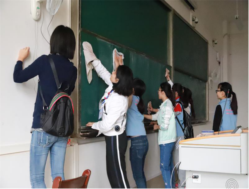 活动开始,成员们积极主动地参与劳动,利用自带的清洁工具,对教室里的门窗、讲台上的物品、墙上的透明胶进行了清洁整理。活动过程中成员们各司其职又相互配合,使得本次活动快速而又圆满完成。