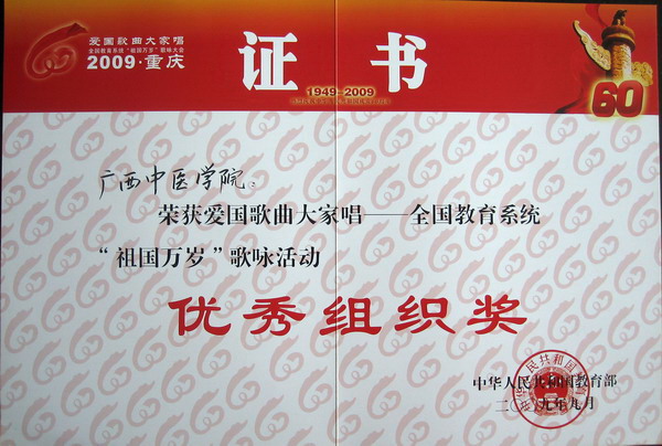 [推荐]团委喜报 日期:2009-09-24 点击数: 次 分享到: 在教育部举行的“爱国歌曲大家唱”全国教育系统“祖国万岁”歌咏大会上,我院荣获“优秀组织奖”荣誉称号。 共青团广西中医学院委员会 打印正文 关闭本页