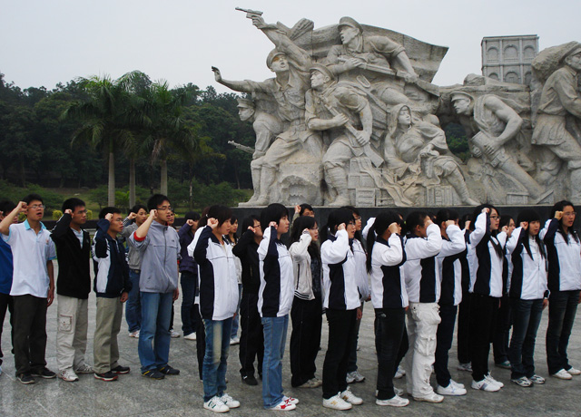 同学们在烈士雕塑像前肃然起敬,主持人宣读祭烈士文,全体同学将自己追寻烈士足迹、忠心报效祖国的铮铮誓言留在了烈士陵园上空。接着,全体同学默哀三分钟,深切怀念烈士。最后,由同学代表向烈士献花,明黄的菊花,寄托着同学们深深的哀思。