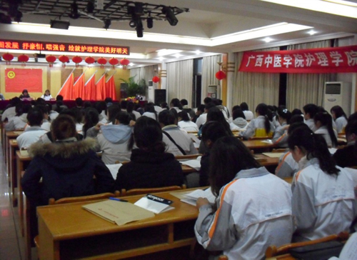2009年12月18日,共青团广西中医学院护理学院第七届团学代会在中医学院大学生俱乐部隆重举行。广西中医学院学工部部长、学工处处长冼锦华,团委书记李月发、护理学院院长吴彬、中医学院团委副书记王春花、护理学院党委副书记罗艺徽、护理学院各科室负责人及各二级学院分团委书记参加了此次团代学代会。