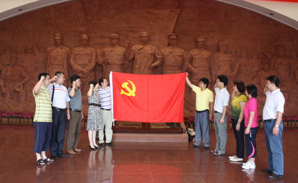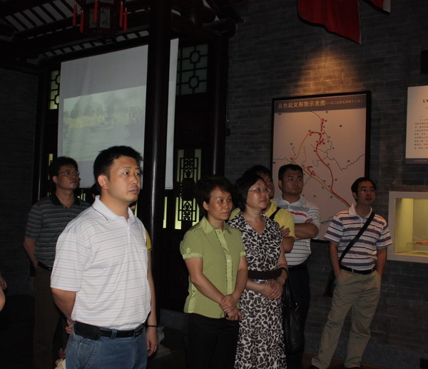 在百色市人民政府副秘书长苏秀冬同志的引领下,党员同志们参观了中国工农红军第七军军部旧址——粤东会馆,并在百色起义纪念馆的英雄浮雕前举行了庄严的入党宣誓仪式。党员们庄严地举起右手,面对鲜红的党旗进行宣誓,牢记党的教诲,重温历史,瞻仰先烈,进行革命传统爱国主义教育和学习。在参观了纪念馆的“百色风雷”、“革命英杰”、“邓小平与百色”等展厅之后,大家一致认为,在百色起义旧址重温艰苦革命历程,接受爱国主义教育,立下对党忠诚的誓言具有很深的现实意义。
