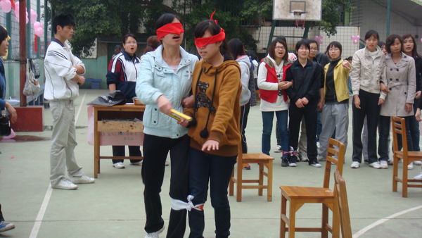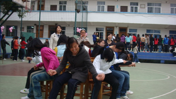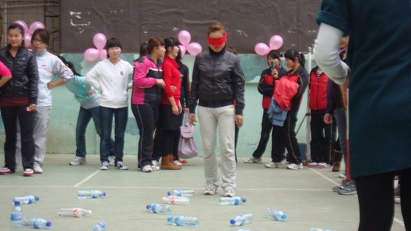 活动还没开始,球场上已是欢声笑语,男生们扛凳子、搬椅子,积极主动的为活动布置场地,用行动来祝福女生。在他们的辛勤劳动下,现场布置得温馨、热烈。首先进行的是集体跳大绳的比赛,老师们在大家的热烈掌声中,用活力和激情的一跳,拉开了整个活动的序幕。此时,各班同学早已摩拳擦掌,跃跃欲试。哨声一响,轻轻一跃,身体划出了一道优美的弧线。经过激烈的角逐,10高护(1)班获得了第一名、08护本获得了第二名、1高护(2)班获得了第三名。接下来是一系列有趣的个人活动:抢椅子、踩地雷、丢牙签、蒙眼敲锣、猜字谜,同学们纷纷参与其中。游戏中各类搞怪的表情动作把大家逗得哈哈大笑。“抢凳子”就颇受大家喜欢。首先,大家手拉手围着凳子旋转,每个人都紧紧盯着离自己距离最近的那张凳子,“停!”工作人员一声令下,每人奋力抢坐到凳子上,未能抢到凳子的同学即被淘汰。一旁的观众也乐此不彼的为他们加油鼓劲,整个活动现场成了一片欢乐的海洋。