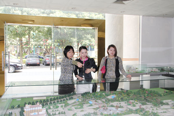 高等职业技术学院邓远美院长(左)为文芳副校长(中)介绍新校区沙盘