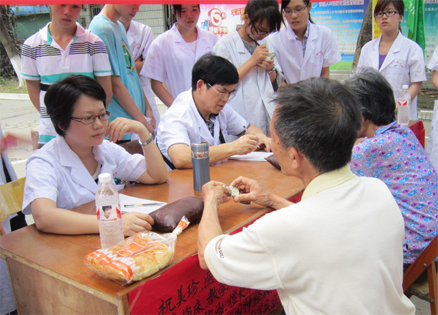 4月15日下午2:00,广西中医学院基础医学院前往南宁市明秀小区继续进行义诊 “学雷锋、树新风、弘医德”义诊活动。活动当天,由易自刚、祝美珍两位专家出诊,学生为居民进行了量血压、推拿按摩、演示功法、针灸、协助老师看病、与小区居民交流养生知识等服务活动。祝美珍、易自刚两位专家耐心地为小区人民看病,同时也为同学们讲解病情的发展、治疗方案及解答同学们的疑问,老师们以精湛的医术赢得了小区居民的高度认可。