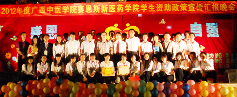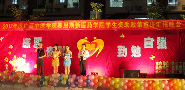 2012年4月14日晚,赛恩斯新医药学院2012年度学生资助政策宣传汇报晚会在篮球场举行。赛恩斯新医药学院副院长叶绘晟、资助管理办公室副主任肖灵铭以及学生工作处黎桂曹、沈仰峰老师出席了本次活动。