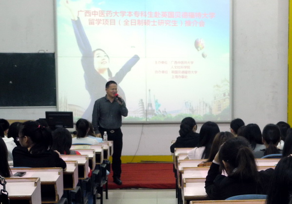 2013年4月26日,人文社科学院分别在赛恩斯新医药学院阶梯教室和beat365正版唯一入口必一明秀校区西梯一教室举行了两场赴英国贝德福特大学攻读全日制硕士研究生项目推介会。人文社科学院党总支书记李怀泽、院长韦兆钧、副院长王碧艳、英国贝德福特大学上海办事处官员柴婷婷女士及人文社科学院相关老师应邀出席。