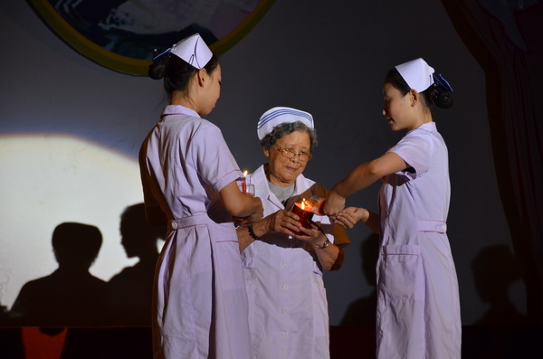 本次授帽仪式以“诚信严谨、敬业博爱”为主题,是继护士文化节开幕式系列活动的高潮环节。吴院(校)长首先为授帽仪式作了简短而富有内涵的致辞。她强调了护理工作是充满爱心的工作,鼓励护生们要热爱护理工作,并对他们寄予了无限的厚望。伴随着悠扬的旋律,在南丁格尔像前,我院(校)穿戴端庄大方的护生们依次上台虔诚地接过授帽领导手中圣洁的燕尾帽,由护理前辈们细心地一一为学生戴上。随后,在德高望重的莫丽英老师向护生们传递象征着南丁格尔精神代代相传的红烛中,仪式走上了另一个高潮。烛光摇曳,他们在学生代表的带领下,举起右手郑重地宣誓。广大护生承诺将不忘今天的决心和誓言,志愿献身护理事业,继承和发扬护理前辈们“燃烧自己,照亮他人”的精神,履行“保存生命、减轻痛苦、促进健康”的职责,遵守护士的职业道德规范,热爱专业,勤勉好学,忠于职守,将毕生精力奉献给护理事业,使患者生命延续,健康重现,幸福永驻,!