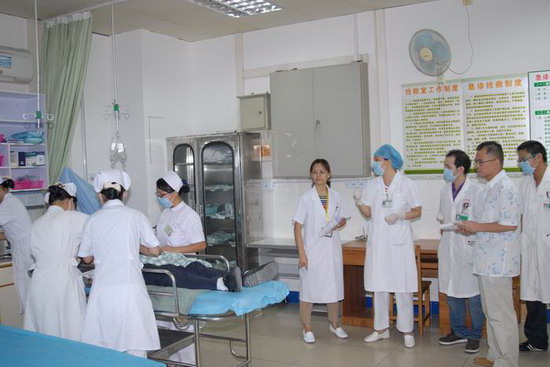 此次演练以医院周边某学校20名学生在学校食堂进食早餐后发生食物中毒为演练背景,主要考察医院急诊科、消化内科、神经内科、肾内科、心血管内科等相关临床科室的应急反应和医疗救治能力以及总值班、院办、医务部、护理部、预防保健科、药学部、设备科、司机班等部门在突发公共卫生事件发生后相互配合、相互协作及应急协调的能力,包括出诊接应、院前急救、院内救治、病人收治分流、病区接收病人、医务人员调配、药品及设备调配等应急处理,直接考核医务人员共20名,考核内容涉及食物中毒相关急救知识、急救技能操作、请示报告制度、急会诊制度及应急反应能力等,最后由医院医务、护理等部门及考核专家对应急处理的各个环节作了点评,总体上各相关科室和人员基本上都能做到反应迅速、报告及时、协调有序、处置得当。