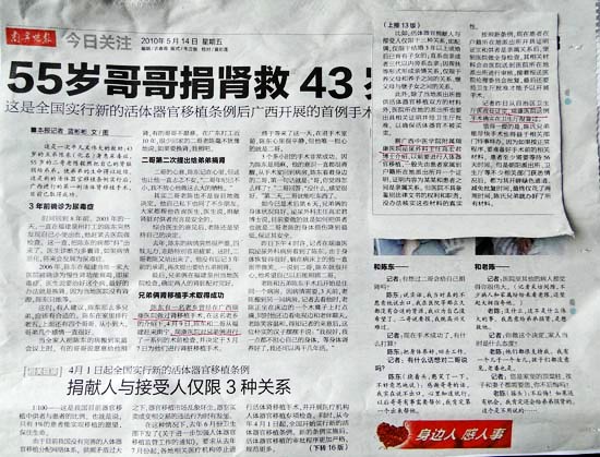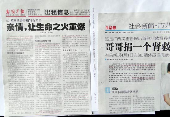 住在泌尿外科病房的兄弟俩来自福建,哥哥陈大林(化名),弟弟陈小林(化名),2006年陈小林在当地一家大医院被确诊为慢性肾功能衰竭,即尿毒症,医生说要治好这个病,最好的办法就是换肾,因为当时没有肾源,只好等待。陈小林有一名老乡曾经在瑞康医院做过肾移植手术,在这名老乡的介绍下,4月9日,陈氏兄弟从福建来到瑞康医院,经过一系列的术前检查,由当地派出所出具证明并报区卫生厅报批后,由瑞康医院泌尿外科主任高宏君博士主刀,3个多小时的手术非常成功,因为之前了解到瑞康医院已经开展了几百台移植手术,手术技术已经非常娴熟,兄弟俩人一直很平静。手术后广西电视台《新闻在线》的记者再一次来到病房对陈氏兄弟进行了采访,兄弟俩恢复的很好,再观察一段时间就可以出院了,采访内容将在近期广西电视台黄金时段播出。