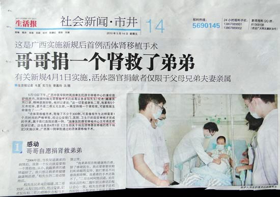 “亲情,让生命之火重燃”;“55岁哥哥捐肾救43岁弟弟”;“哥哥捐了一个肾救了弟弟”等等,5月14日,《南国早报》、《南宁晚报》、《生活报》等广西各大主流媒体大篇幅报道了这样一个感人的事迹,以及实现患者愿望的高难度手术,广西中医学院附属瑞康医院泌尿外科再一次让人领略到了其在广西肾移植手术方面的强大实力。瑞康医院是国家三级甲等医院,广西首家国家卫生部内镜专业技术泌尿外科培训基地,国家卫生部指定器官移植单位。