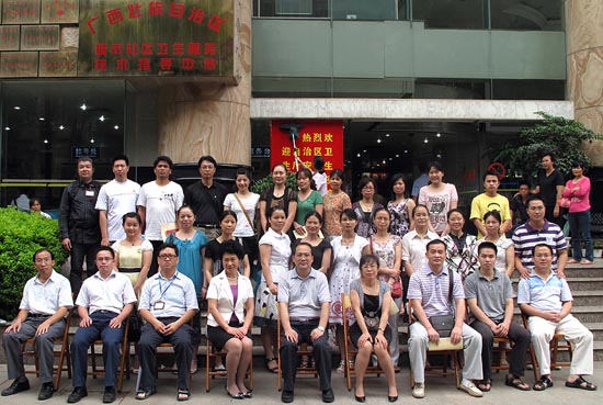 开班仪式结束后,广西城市社区卫生服务技术指导中心主任张春及常务副主任梁永华和学员们合影留念。