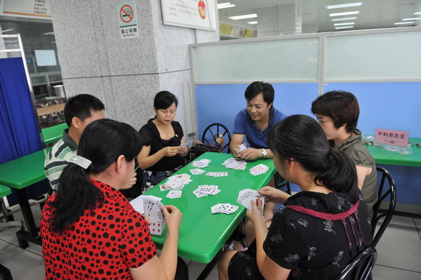 为喜迎2011年国庆节和广中医建院70周年的到来,增进同事交流和友谊,展示广中医人风采,一附院工会今年组织多项比赛。在书画摄影展结束之后,广西中医学院第一附属医院第二届职工扑克连牌(拖拉机)比赛于2011年9月14日在医院营养食堂正式开赛,经过三个阶段单淘汰赛共18场的激烈角逐,于9月15日晚落下帷幕。