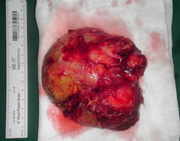 骨脊柱一区陈远明主任,陈锋主任,周先明及黄民锋副主任详细了解患者病情后,结合本院的盆腔MRI增强及盆腔彩超提示:盆腔内肿物混合性回声,肿物约11×9×10cm大小,考虑神经源性肿瘤?另胃肠外科、肿瘤科、妇科等科室会诊后都建议尽快手术治疗,了解肿物性质。陈远明主任集中科室成员意见后,考虑该肿物为神经源性,首先考虑脊索瘤,该瘤好发于颅底及骶尾部,为低度恶性的肿瘤,切除后易复发,一般术后需放疗;畸胎瘤也不能排除,该瘤中可能出现头发、骨组织等;还有可是罕见的巨大神经鞘瘤,该瘤属于良性。结合患者目前身体状况,认为肿物过大与周围组织粘连,重要血管分布集中,肿物蒂部血管丰富,术中出血量多,采用前路经腹膜外切口切除肿物。陈远明主任及周先明副主任亲自主刀,手术过程顺利,肿瘤重量约1000g左右。