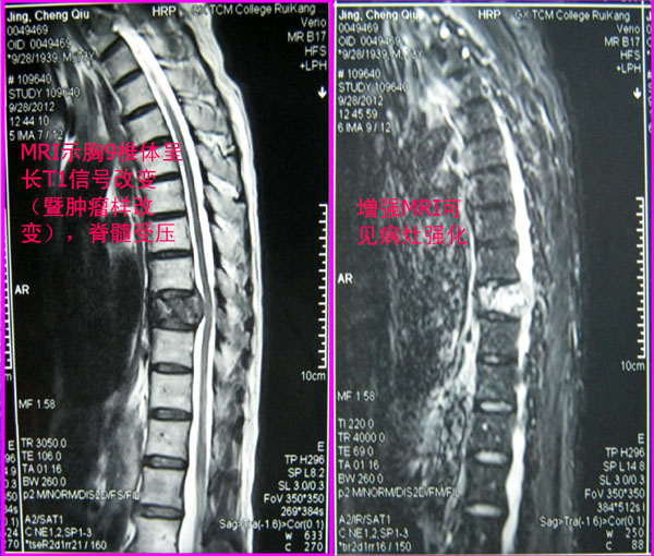 胸椎MRI检查示胸9椎体及椎弓呈长T1异常信号改变,椎体后缘突入椎管,脊髓受压,增强MRI可见病灶强化影