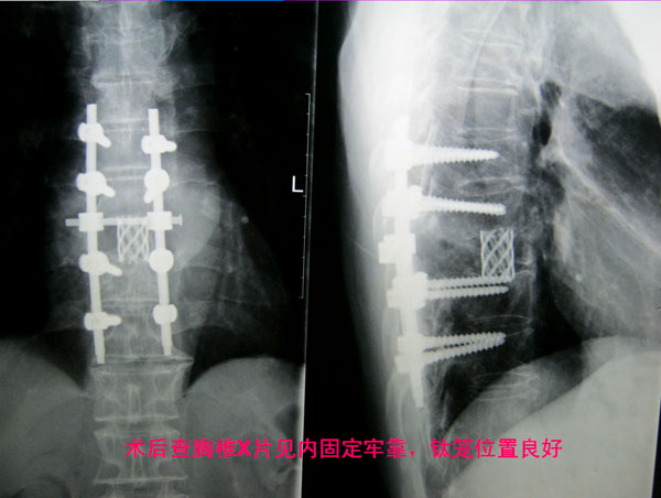 术后查胸椎X片见内固定牢靠,钛笼位置良好