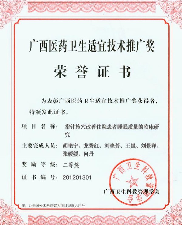 护理部胡艳宁主任、龙秀红副主任及刘晓芳科护士长等负责的课题“指针施穴改善住院患者睡眠质量的临床研究”获广西医药卫生适宜技术推广奖二等奖。此成果已在广西各家医院及社区推广应用,并取得很好的社会效益和经济效益。