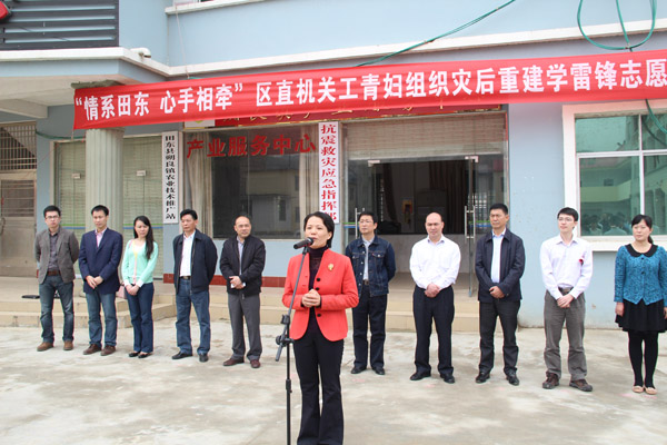 区直工委副书记倪萍在“请系田东 心手相牵”区直机关工青妇组织灾后重建学雷锋志愿服务活动中讲话