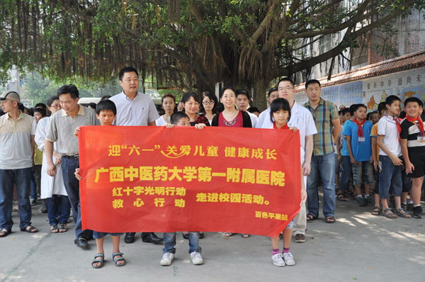 2013年5月23日,一附院党委副书记、纪委书记、副院长吴西西和副院长桂雄斌带领外七科、外二科、医务部负责人以及相关医务人员组成的专家组走进百色市平果县第一小学,开展“迎六一 关爱儿童 健康成长”——“光明行动”“救心行动”进校园活动,活动旨在为该校小学学生开展视力、心脏筛查。