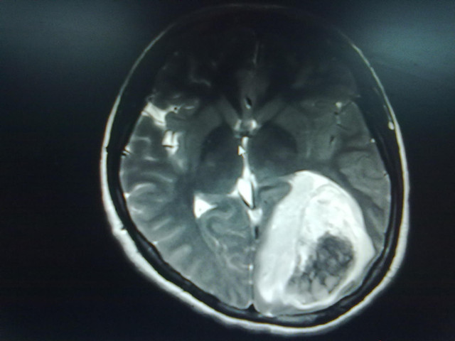 经紧急术前准备,患者很快送进了手术室,麻醉插管、生命监测、消毒铺巾等有序展开。打开患者颅骨可见脑膜似硬皮球样坚硬,脑膜张力大、脑压极高;切开脑膜后,见大面积脑组织受肿瘤侵犯,大量变性脑组织及肿瘤组织外涌,肿瘤大小约80×70×70MM3,肿瘤边界不清,血供丰富。经缓慢减压,清除血肿,仔细分离肿瘤,成功切除全部脑肿瘤组织及血肿。术后病理报告:间变型星形胶原细胞瘤(Ⅲ级)。