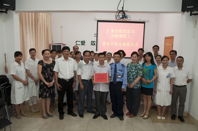 今年4月,黄承江的妻子何兰芳(46岁)不幸患上了鼻咽癌,两次化疗后就已花费了三万五仟多元。当医生告知其妻子的后续治疗费还需要将近六万元时,目前独自支撑全家的黄承江顿时感到压力倍增,力不从心。得知黄承江的困难后,他所在的后勤保卫办公室尽可能地在他的工作上给予了关照。与此同时,分院党总支部向全院党员和广大员工发出捐款倡议,以帮助黄承江一家解决燃眉之急。一方有难,八方支援,能帮就帮的仁爱人纷纷响应,发出倡议短短几天,就有323名专家、员工参与捐款,共募集爱心款24625.00元。