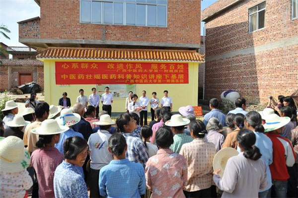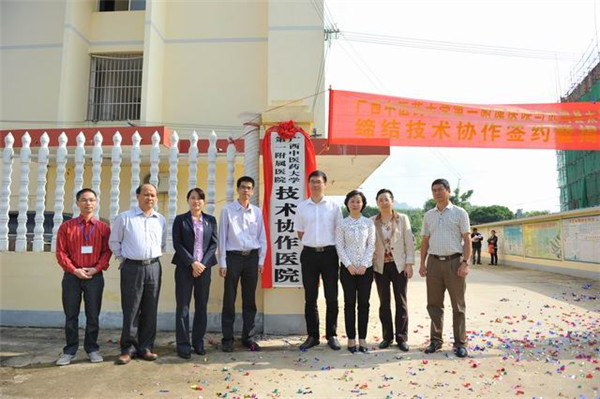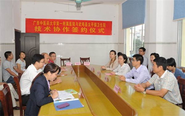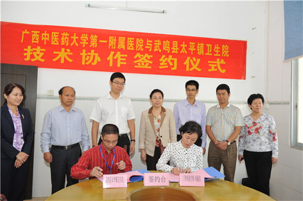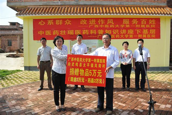 2013年9月27日,一附院党委书记李敏智、学校党委办公室副主任周德喜、一附院党委副书记、纪委书记、副院长吴西西、副院长周建国,带领一附院相关职能部门负责人及临床科室教授博士团20余人,来到对口联系点武鸣县太平镇凤阳村开展“美丽广西 清洁乡村 美丽医院”活动,将“千场中医药壮瑶医药科普知识讲座和义诊”带给当地群众,与太平镇卫生院举行缔结技术协作签约暨揭牌仪式,并向凤阳村村委、村卫生所捐赠了共计5万元的药品和现金。武鸣县县委常委、副县长廖伟行、县卫生局党委书记陆金健、太平镇党委书记岑玉寒、镇卫生院院长李盛良、凤阳村村委书记梁文彦和200多名当地群众参与了本次活动。技术协作签约仪式和捐款仪式由太平镇党委书记岑玉寒主持。