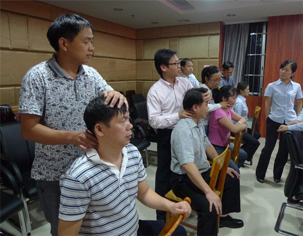 讲座上,王明杰医生结合银行职员的工作特点,传授中医治未病理念,讲述颈椎病的症状、成因、好发人群以及颈椎病的防治等,提醒大家要预防颈椎病,需从日常培养良好的生活习惯做起:一是保持正确的姿势,二是注意防寒保暖,三是选择适合的枕头,四是注意良好的休息,五是坚持做颈椎操,六是适度平衡运动(如游泳等),七是经常按摩与泡热水浴。他说这七种方法能够有效地预防颈椎病,对于职场人员而言是简便易学又经济实用的养生法宝。在现场,王明杰医生教会大家一套颈椎功能保健操,使大家随时能呵护颈椎,预防颈椎疾病的发生。