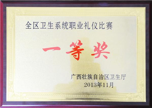 2013年11月5日、6日,广西卫生厅在广西卫生技术学院分别举办了卫生系统区直和全区职业礼仪比赛,来自区直21个代表队和全区卫生系统17个代表队参加了比赛。一附院礼仪代表队参加了本次职业礼仪比赛,并取得两个一等奖的好成绩。