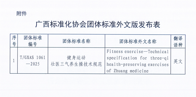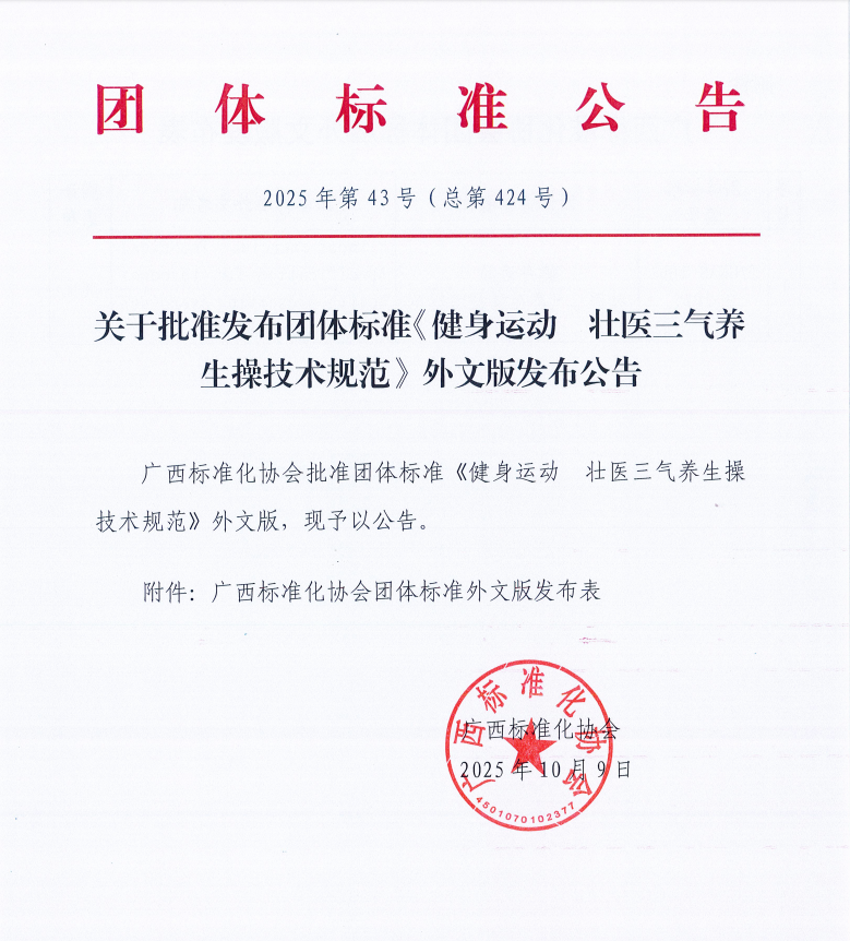 恭喜!壮医三气养生操技术规范团体标准英文版发布实施