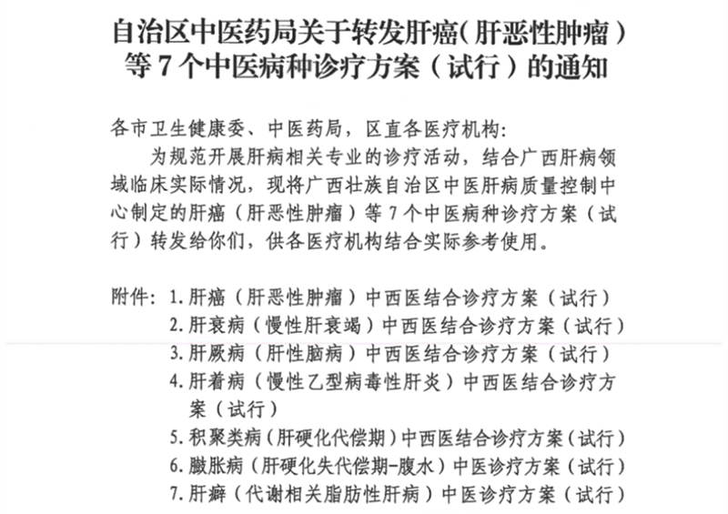 为贯彻落实《广西中医药壮瑶医药发展“十四五”规划》,进一步提升全区中医肝病诊疗水平,近日,自治区中医药管理局正式印发《肝癌(肝恶性肿瘤)等7个中医病种诊疗方案(试行)》。该系列方案由广西中医肝病质控中心牵头制定,凝聚了全区肝病领域专家的智慧与经验,旨在为肝病诊疗提供科学、规范、实用的中医/中西医结合参考依据。