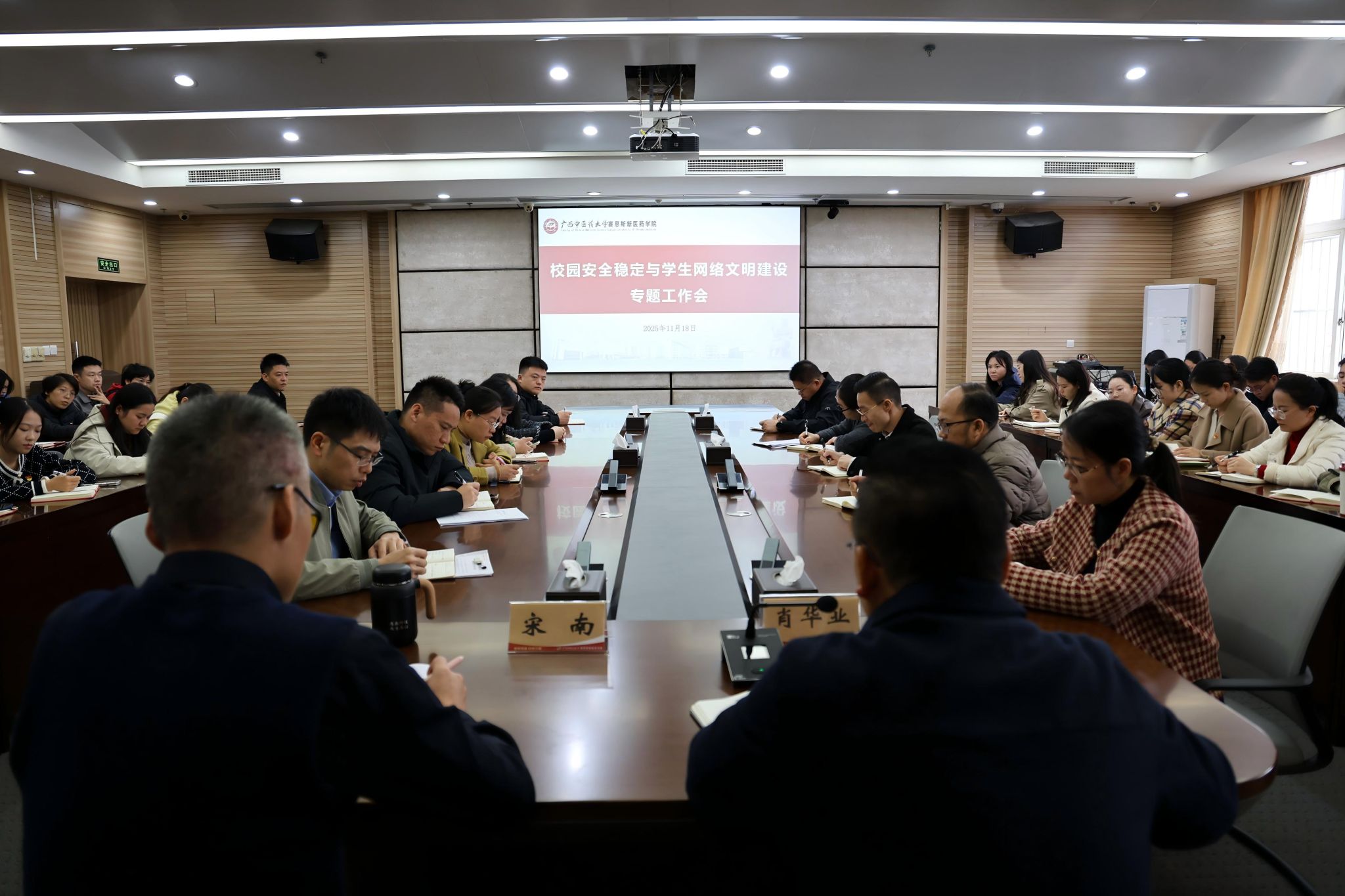 为进一步筑牢校园安全防线,加强学生网络文明素养教育,11月18日上午,赛恩斯新医药学院组织召开校园安全稳定与学生网络文明建设专题工作会。赛院党委书记肖华业出席会议并提出工作要求,党委副书记宋南主持会议并部署相关工作。