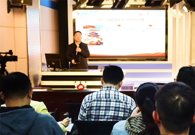 胡跃强以《深学笃行党的二十届四中全会精神 锚定“十五五”规划 勇担教学育人时代使命》为题,为与会人员讲授了专题党课。他围绕全会精神的核心要义、“十五五”规划对医学教育的战略部署,强调要坚持党的全面领导,落实立德树人根本任务,推进医教协同与教学改革,为健康中国建设培养高素质中医药人才。