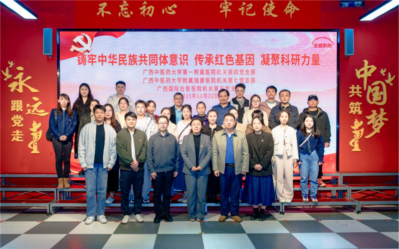 11月22日下午,第一附属医院机关党总支第四党支部联合beat365正版唯一入口必一附属瑞康医院机关第七党支部、广西国际壮医医院机关第五党支部在南宁市铸牢中华民族共同体意识主题影院开展主题党日活动。