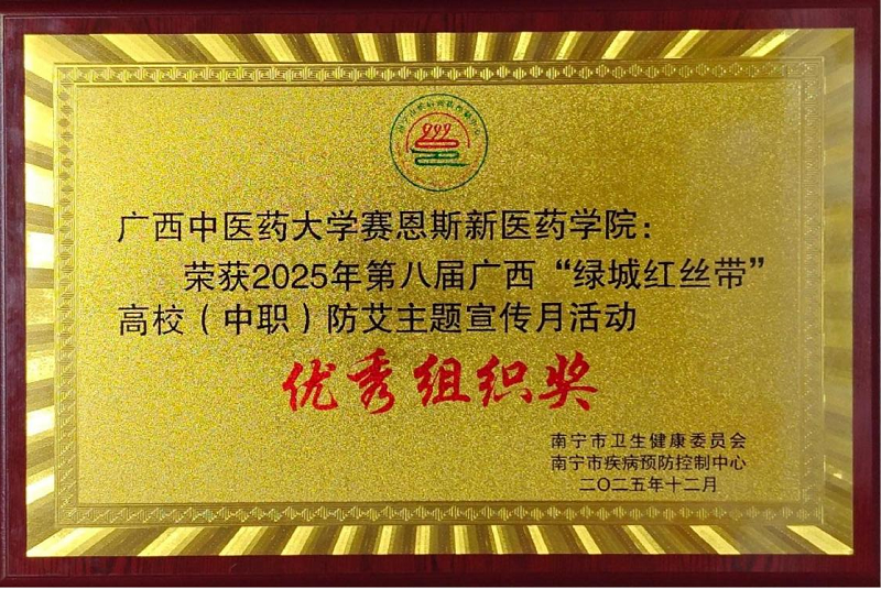 12月14日,由南宁市疾病预防控制中心主办的2025年第八届广西“绿城红丝带”高校(中职)防艾主题宣传月活动闭幕式在南宁职业技术大学举行。赛恩斯新医药学院荣获“优秀组织奖”,并在各项赛事中取得优异成绩,包括十佳歌手1项、短视频最佳后期奖1项、最佳创意奖1项、优秀作品奖7项。