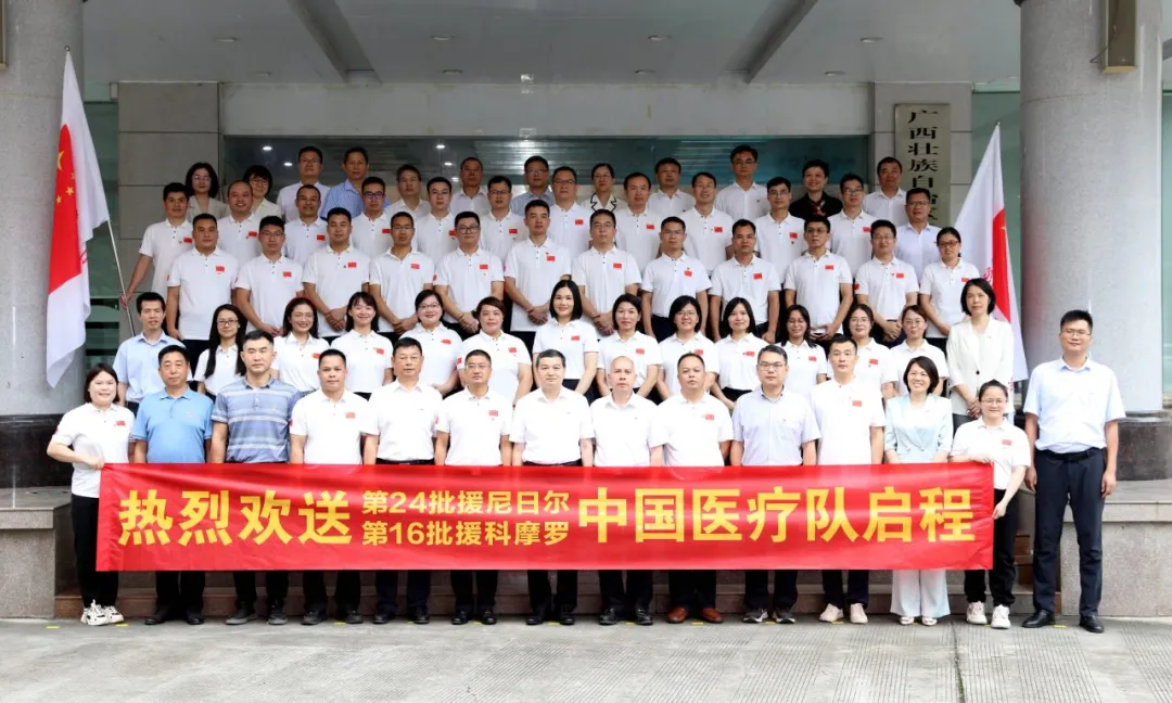 6月7日上午,由自治区卫生健康委组织选拔的第24批援尼日尔、第16批援科摩罗中国医疗队欢送会在南宁举行。自治区卫生健康委党组成员、副主任李勇强,自治区卫生健康委党组成员、自治区中医药局党组书记、局长黎甲文出席,beat365官网附属国际壮医医院党委书记秦祖杰出席并作为派员单位代表发言,beat365官网10名援非医生参加。