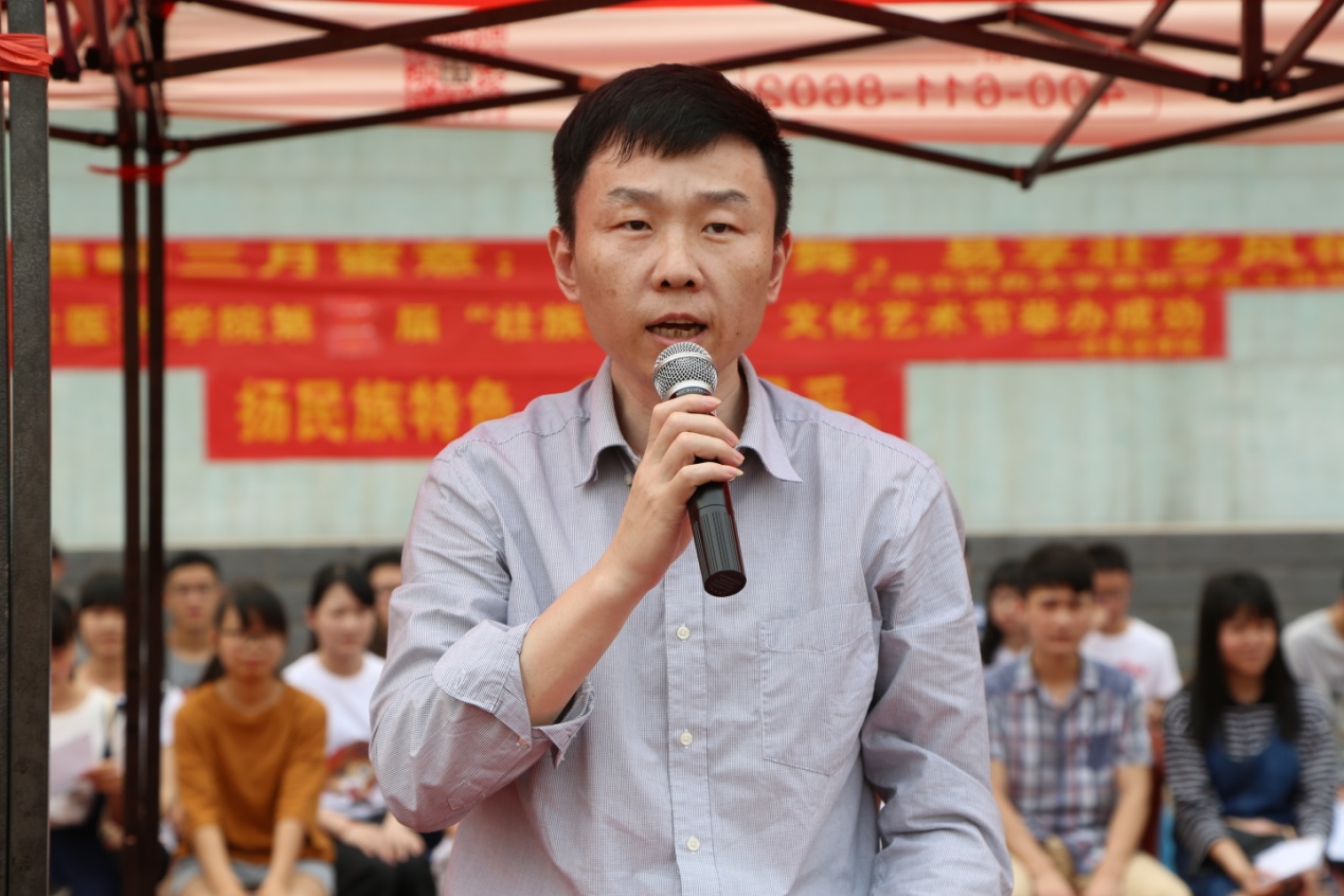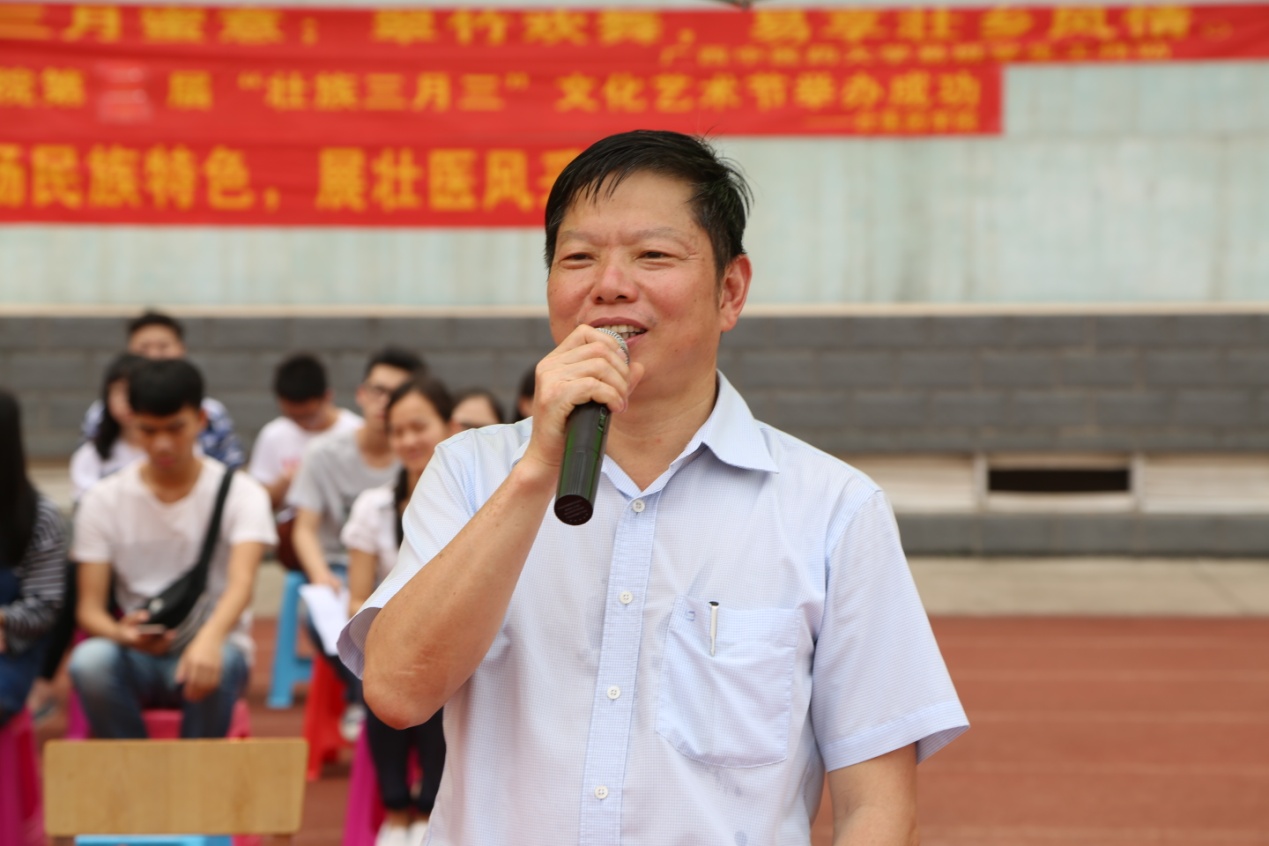 壮医药学院林辰院长对莅临开幕式的嘉宾表示了热烈欢迎,并希望以此次活动为契合点,为各民族同学提供一个平台,让各族同学互相认识和了解民族传统文化,增进民族情感,一展壮医风采,共同营造喜庆和谐的节日氛围。
