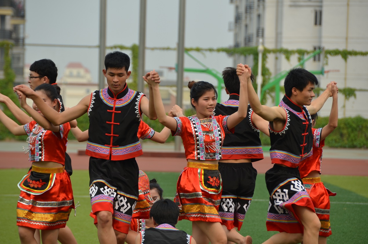 最后,本场开幕式在极富壮族特色的竹竿舞表演中完美落幕。跳舞者在竹竿有节奏、有规律的分合的瞬间,敏捷地进退跳跃,潇洒自然地做各种优美的动作。当一对同学灵巧地跳出竹竿时,持竿的同学高声地呼喝出“嘿!呵嘿!”,现场欢快的节奏,阵阵竹竿清脆的敲打声,曼妙的舞姿引来了同学们阵阵的欢呼声,也吸引了其余学院学生的阵阵掌声。