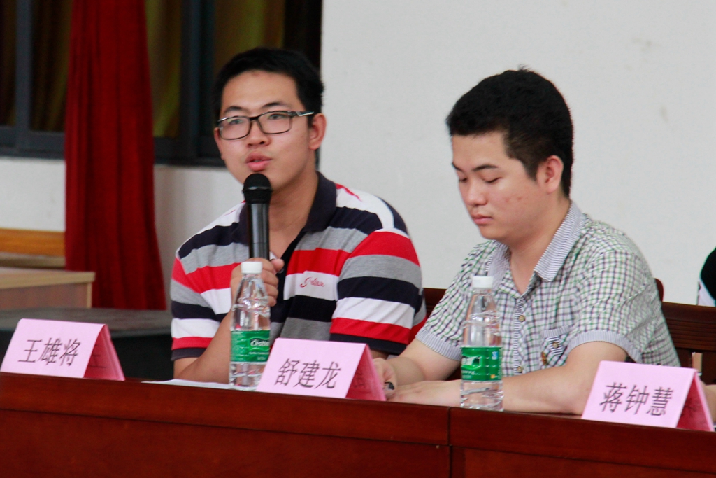 王雄将从自己入学的经历谈起,分享了作为学生会主席做到学习工作两不误的方法,强调做好学生干部要做到“不忘初心,方得始终”。他给学生干部提出了几点建议: “学生干部必须具备三项能力:执行力、思考力和统筹力。大一的学干,要有执行力,勤动手,了解活动举办流程;大二的学干,要有思考力,思考如何处理事情才能达到理想的效果;大三的学干,要有统筹力,要把每个成员放在能发挥他特长的位置。”